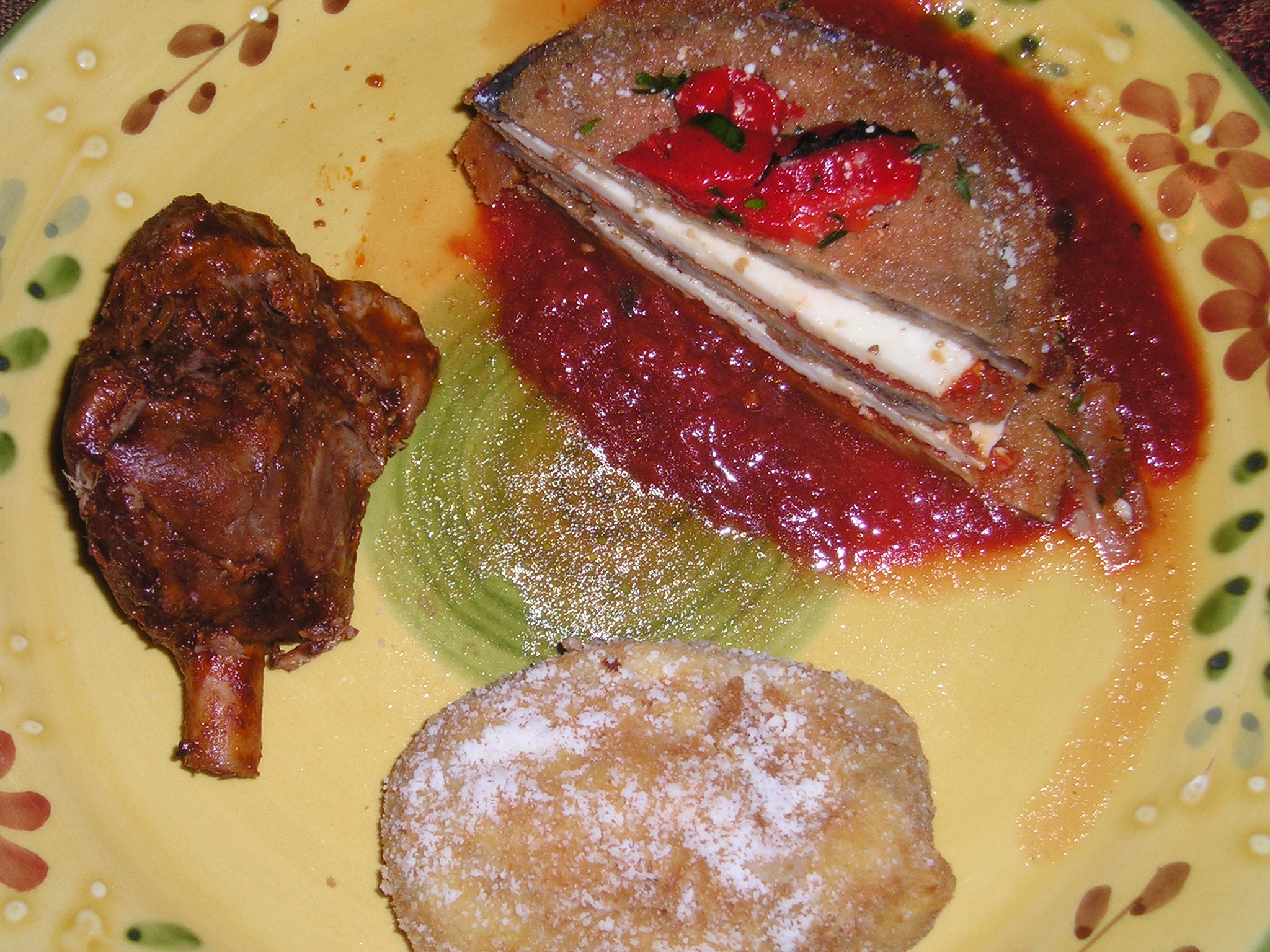 I can recommend anything I’ve tried from that case, only depending on your personal taste, including eggplant stacks (with mozzarella), Italian Pork Chops, and potato and rice croquettes (see photo).  I also enjoyed a gigantic stuffed artichoke (wrapped to go with paper into a tall cone, complete with cherry and orange twist on top).  In the butcher case (i.e. uncooked), I found tasty pork braciole tied with string, and good, not-too-salty mild Italian sausage.