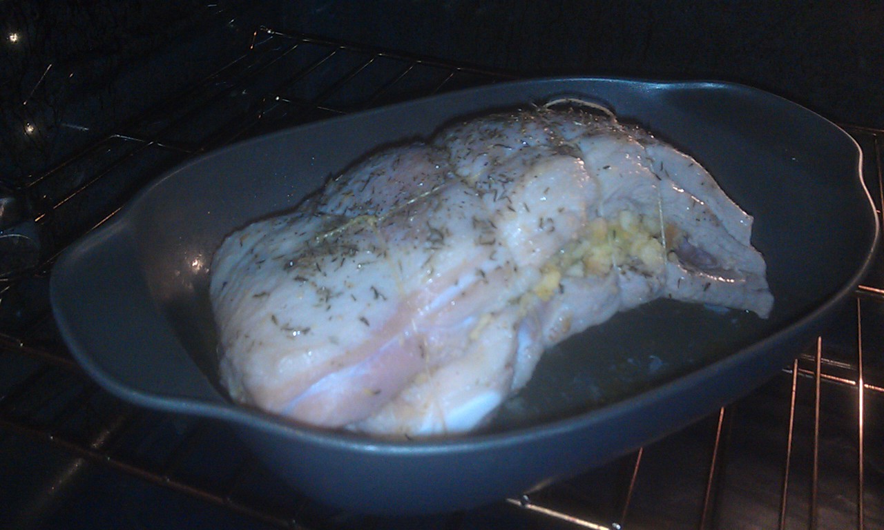 First, here is a gorgeous stuffed, roasted breast of veal. This is one of my favorite dishes and this time I planned well, and allowed plenty of time for long slow roasting. There is also a photo of it as it went into the oven.