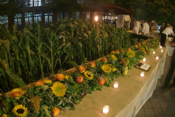 The scene of late-summer corn, sunflowers, herbs – and are those tomatoes I see nestled in the foliage on the curved table there? – was idyllic. Of course, that expanse of table was eventually filled with platters of food from Jim’s kitchen. And, of course, the food was delicious, but it was the corn, the bounty of summer that was all around us, that put this celebration over the top.