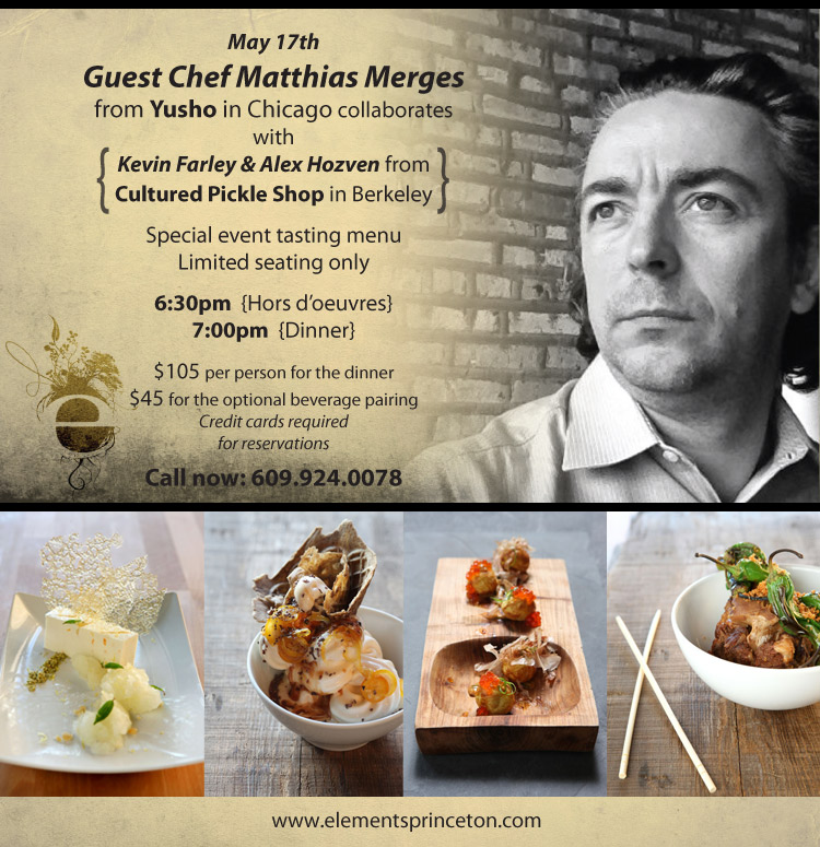 Chef Matthias Merges & Cultured Pickle Shop – On Friday, May 17, Chef Matthias Merges of Yusho in Chicago will cook a seven-course meal with Chef Anderson, utilizing products from the Cultured Pickle Shop in Berkeley, CA created especially for the occasion. Pickling gurus Alex Hozven and Kevin Farley spent weeks working closely with the two chefs to develop ingredients that will be featured on the menu—which will be heavily inspired by Japanese culture and cuisine—including fermented myoga, koji, and squab fermented in sake lees. The event is $105 per person, exclusive of tax and gratuity, with an optional $45 beverage pairing. The evening begins with hors d’oeuvres at 6:30pm, followed by a seated dinner at 7:00pm.