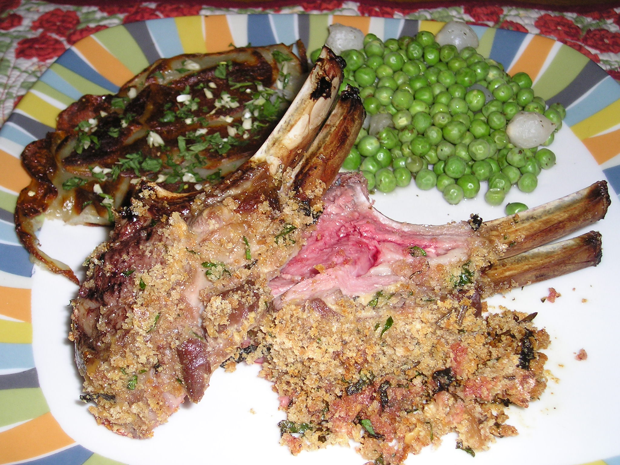 Ahhh, Easter dinner! It seems ages ago, and I guess it was. I took the trouble to make a rack of lamb, potato galette, and fresh peas with pearl onions.The photo of the meal doesn’t show off the galette well at all, so I include a separate photo of that at the front of this post. And although the lamb looks messy on the plate here, it was just delicious, and not as raw as it seems to look!