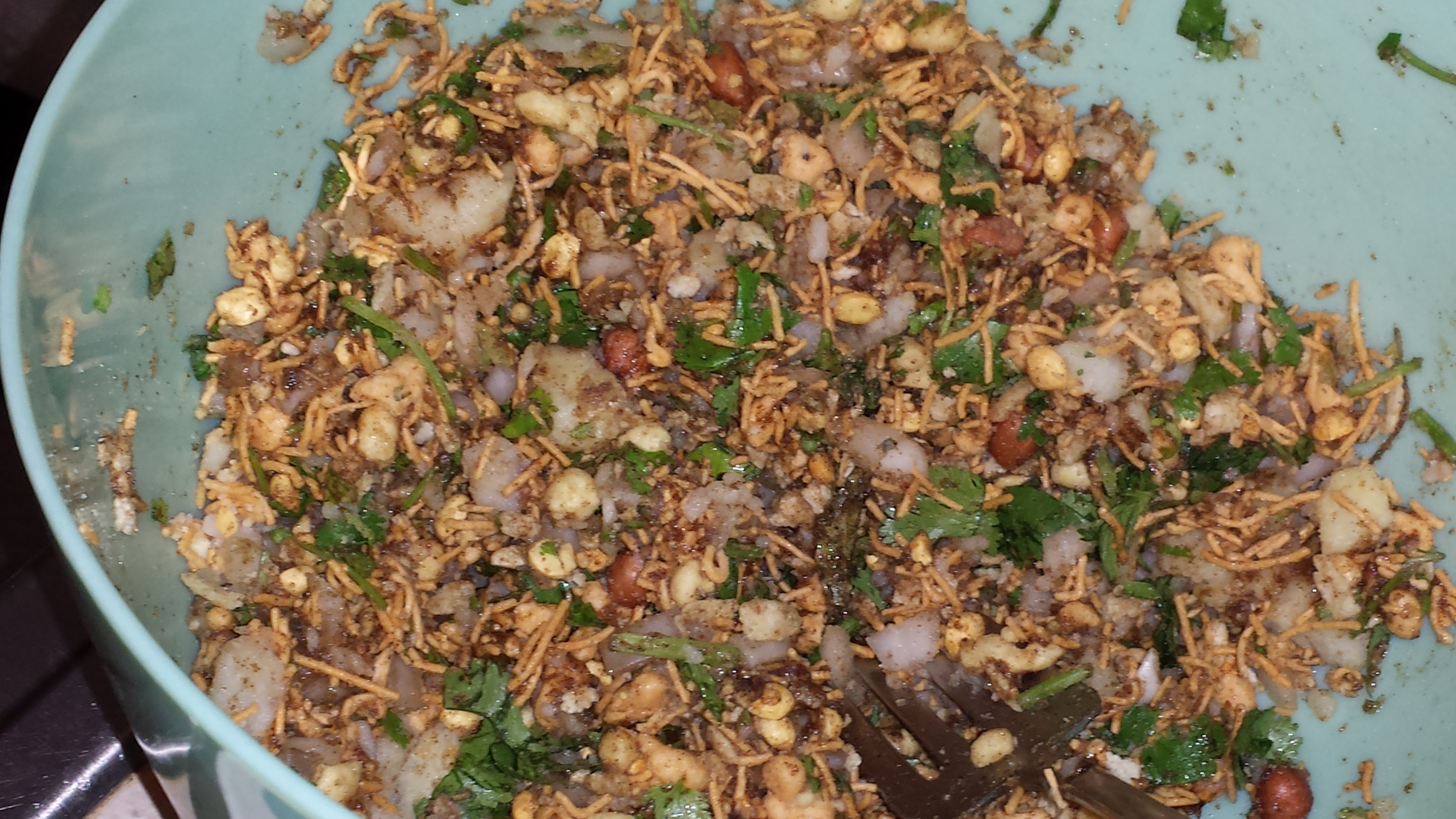 I lived nearby then, so walked over after a friend tipped me off to this tasty treat, and I was captivated at the first bite. Oh my! So much flavor, lots of wonderful texture, just enough spice to make it interesting, and altogether a wonderful cooling snack on a hot day. The dish was full of interesting bits of stuff: puffed rice, crisp noodle pieces, and many more ingredients, most of them crunchy. I also spied a lot of cilantro (which I love), bits of cooked potato, and there was some dressing or sauce mixed in, too, which acted like a bit of binder, just enough so you could get a forkful of the bhel to your mouth without embarrassing yourself (well, too much).