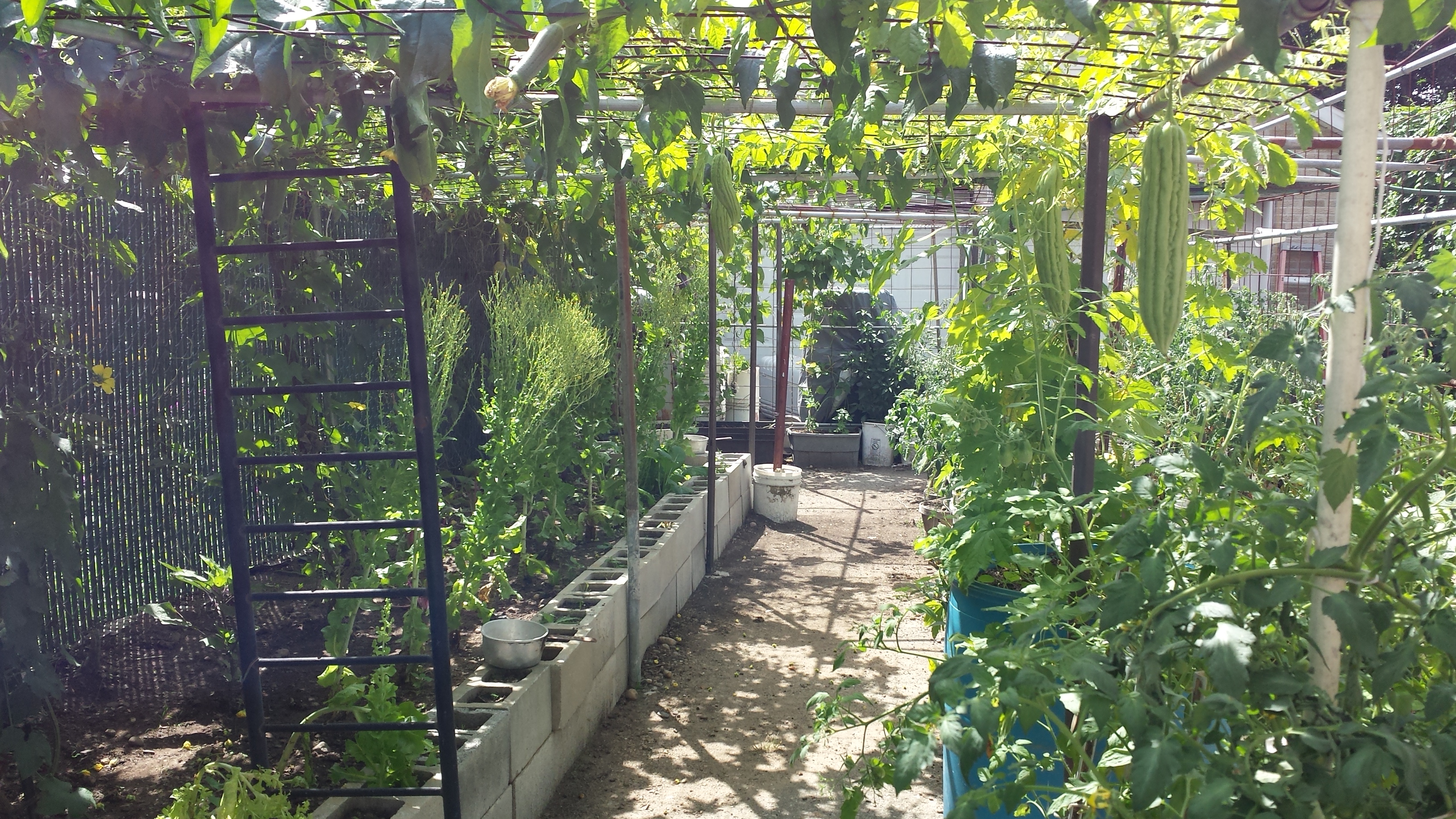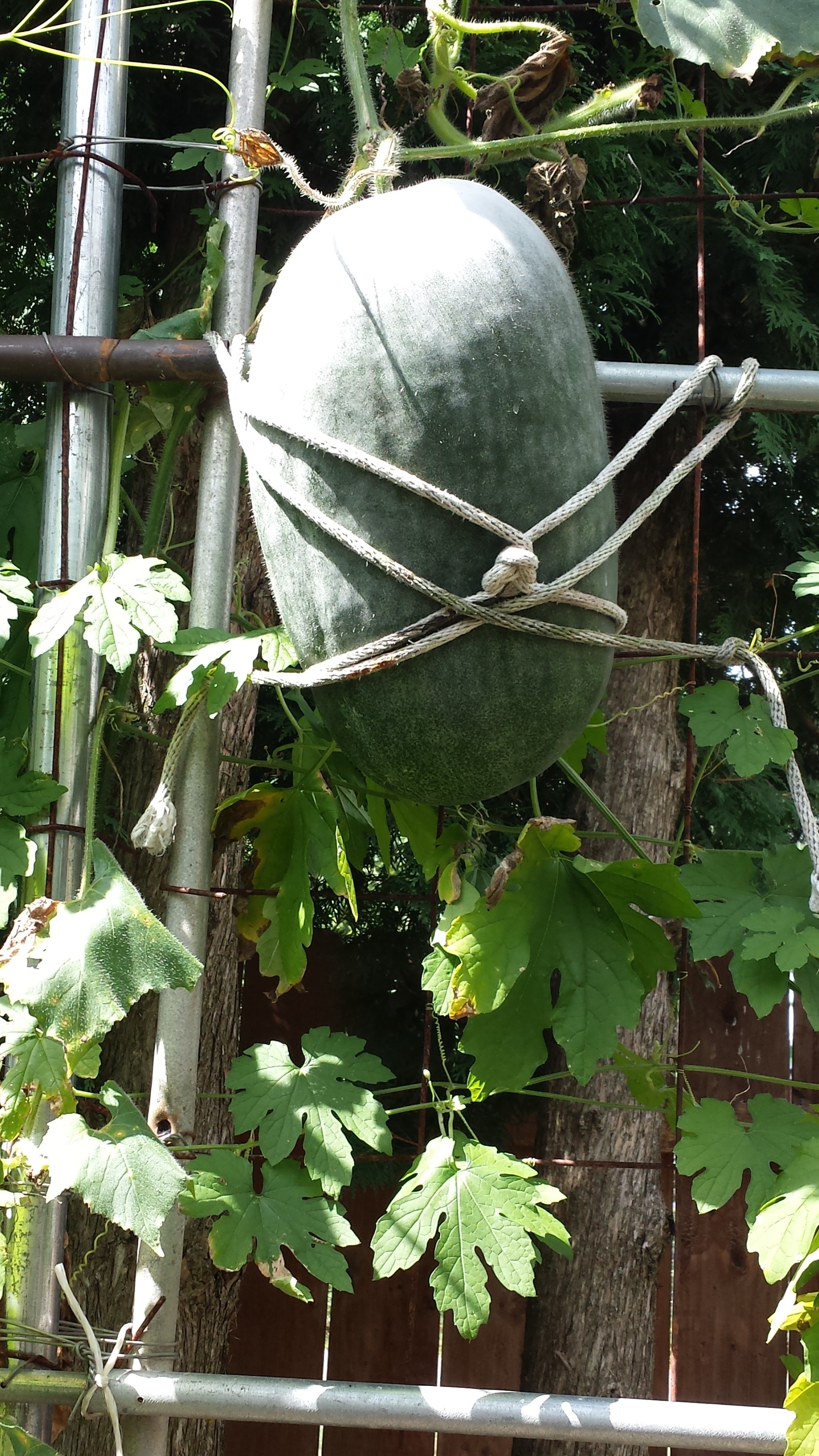 And here’s something else most people entering Lin’s Palace might not know: a short distance away is Mr. Lin’s real palace – an extensive trellised garden in the backyard of his home. There he grows many of the squash, bitter melons, tomatoes, flat beans, and other produce for his restaurant. It’s all pesticide and chemical free, too, he proudly says, because he has no problem with pests. I credit that to the good air circulation trellis growing promotes, it’s like a maze of climbing vines with some shorter plants like eggplants and herbs closer to the ground. He grows so many kinds of squash, and I loved seeing a large wintermelon (lower right) trussed up to keep it from falling off the vine!