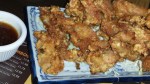 My food co-explorer Pat Tanner whisked me up Route 27 to Rai Rai Ramen for an article she’s working on (not a review), and besides trying a couple of the Taiwanese dishes that were the original draw, we also had ramen (of course!), and this delicious fried chicken (boneless). Since it has mochi in the name, I’m thinking the coating is rice flour. They use dark meat, so it’s moist, oh so moist, and the dipping sauce was fantastic too. Also had interesting Japanese Fried Rice and elongated “gyoza” dumplings. And a big oyster omelet that was good, but not the best I’ve had. Overall, I really liked this place though, and our lively waiter was a real plus. Go try it. I’ll let Pat tell you later on about the other dish she ordered, one we weren’t allowed to eat there, so she took it home.