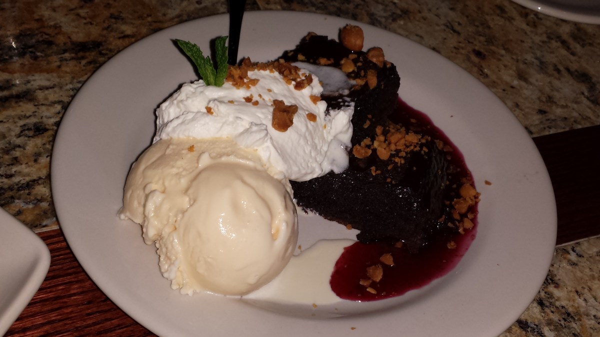 20140123_201009 Published at 3264 × 1836 Gluten-free (flourless) macadamia nut brownie with raspberry sauce, ice cream and whipped cream.