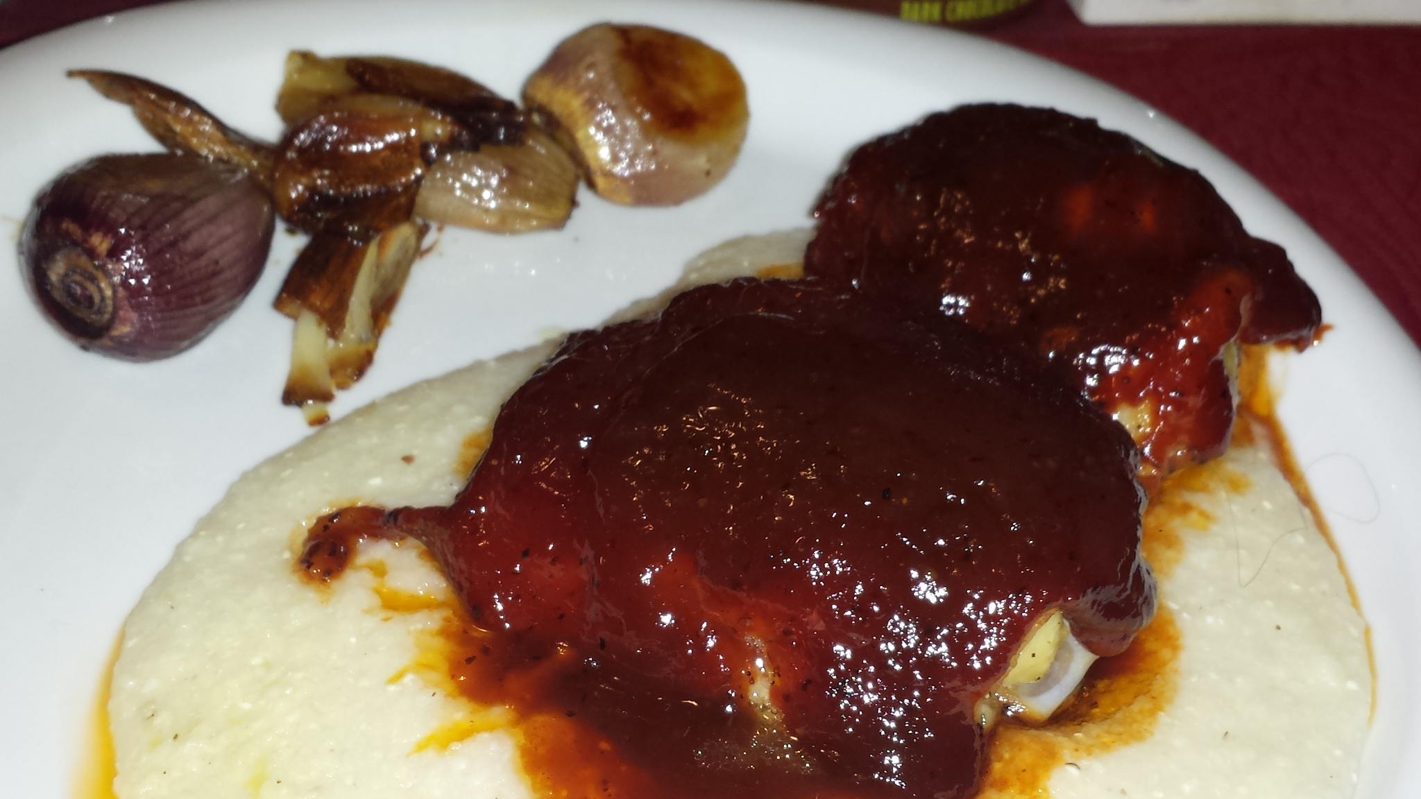 I also have wonderful leftovers from a dinner of baked bbq chicken thighs and Anson Mills grits last night.