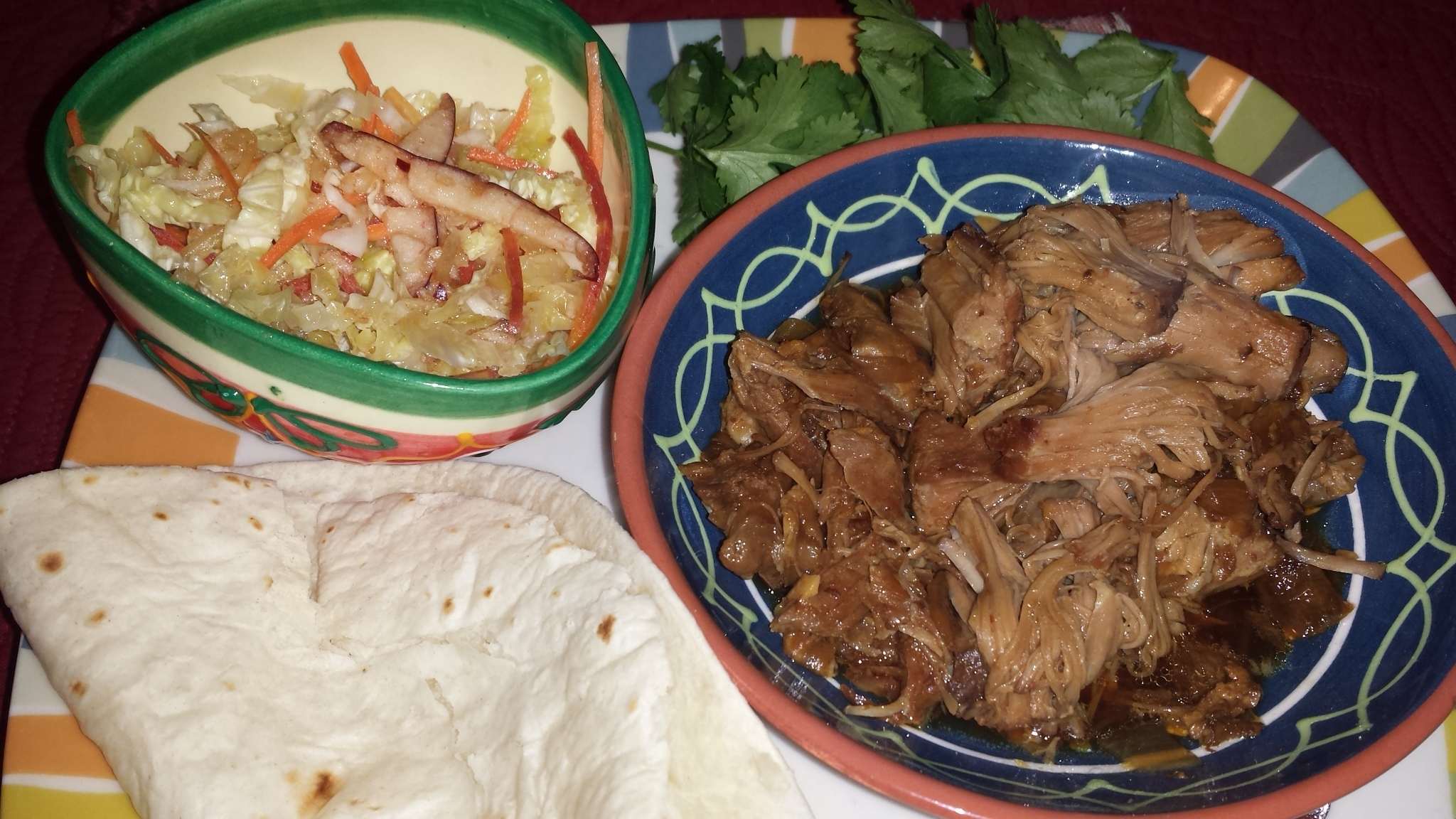 I could not resist making Sifton’s Vaguely Vietnamese Slow-Cooker Pork Tacos from his article, and they were fantastic. I had wonderfully juicy and messy tacos for a couple dinners, then another night enjoyed the pork over a brown rice blend from Lotus Foods with more of the good slaw (also in the recipe) on the side. I had improvised the slaw recipe to use up things I had on hand, which, unusually, included a small Savoy cabbage.