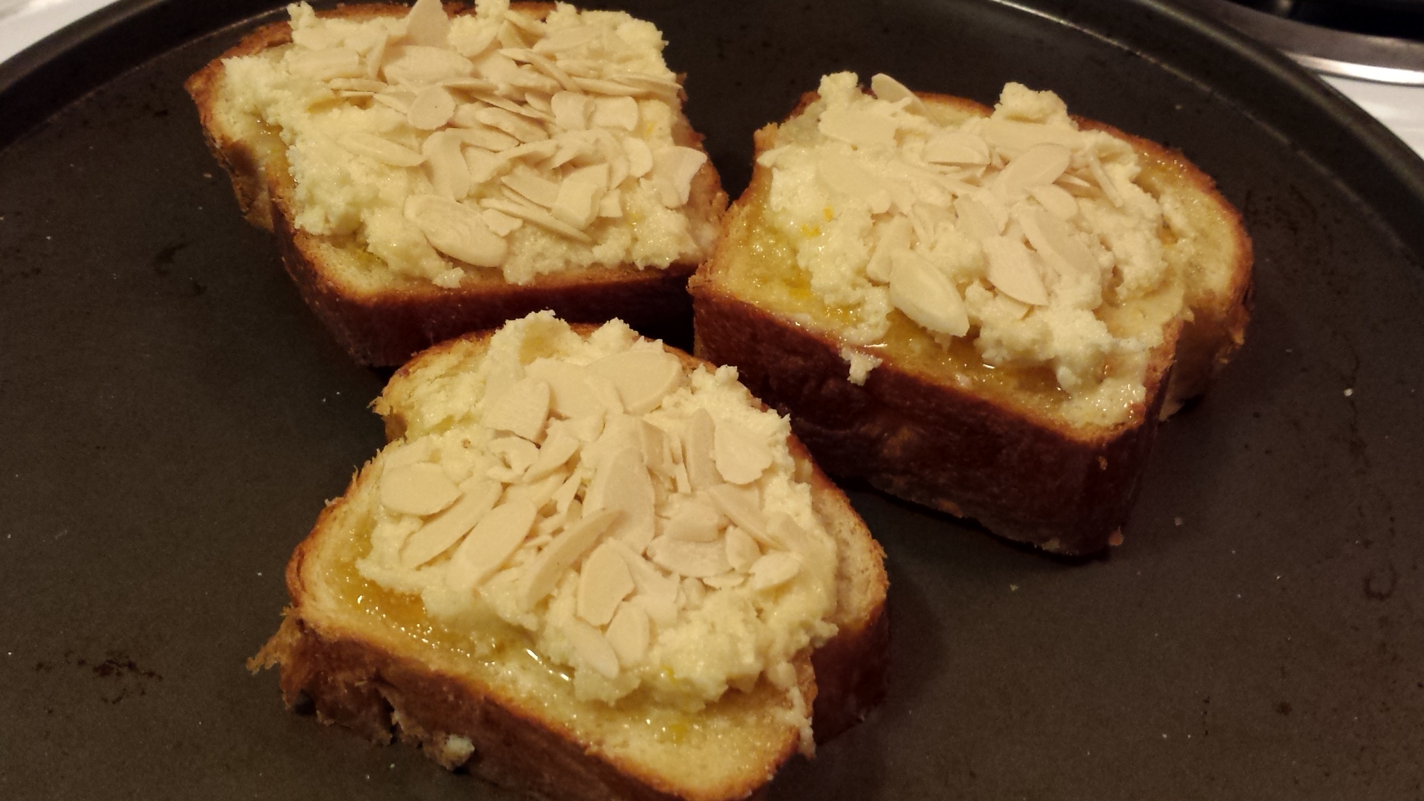 Assemble: Preheat oven to 350 degrees. Slice bread into 3/4- to 1 1/2-thick slices, or set halved rolls cut side up. Brush with syrup. Spread 2-3 tablespoons almond cream on each slice, spread not quite to edges. Top with almonds, pressing them gently.