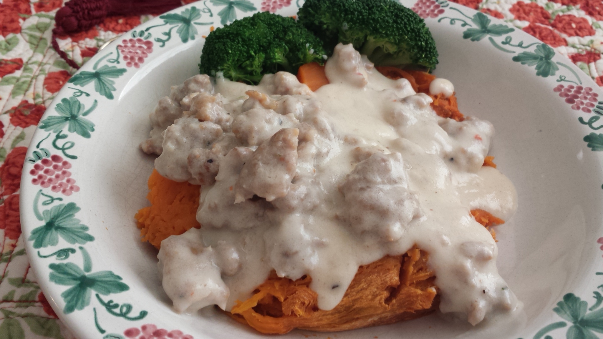 20150629_192816 Published at 2048 × 1152 in June’s Best Bites « Previous Next » Sausage gravy on sweet potato (instead of biscuit, so virtuous!)