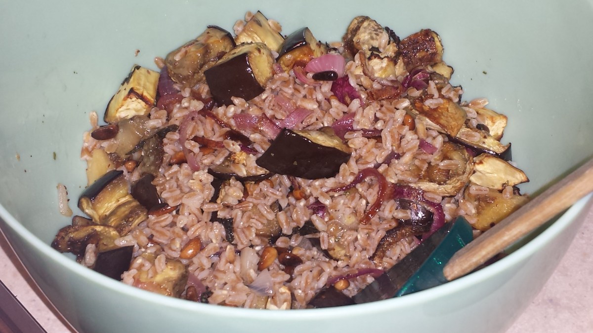 20150817_163238 Published at 2048 × 1152 in August Best Bites « Previous Next » Eggplant Farro Salad, so handy to have in the fridge