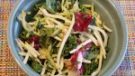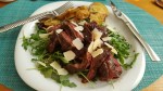 The skirt steak over arugula is a recipe in Julie Powell’s Cleaving: A Story of Marriage, Meat, and Obsession, the book she wrote after Julie and Julia made her famous. It’s about the destruction of her marriage (by her, sadly) and learning to butcher. Talk about breaking things down… In spite of wanting to throttle her, I kind of liked the parts about butchering, and this recipe is one of several in the book. The steak is simply marinated in olive oil, balsamic vinegar and rosemary and quickly seared, then sliced and put over arugula with shavings of cheese. She may have said Pecorino, but I had Parmesan so…