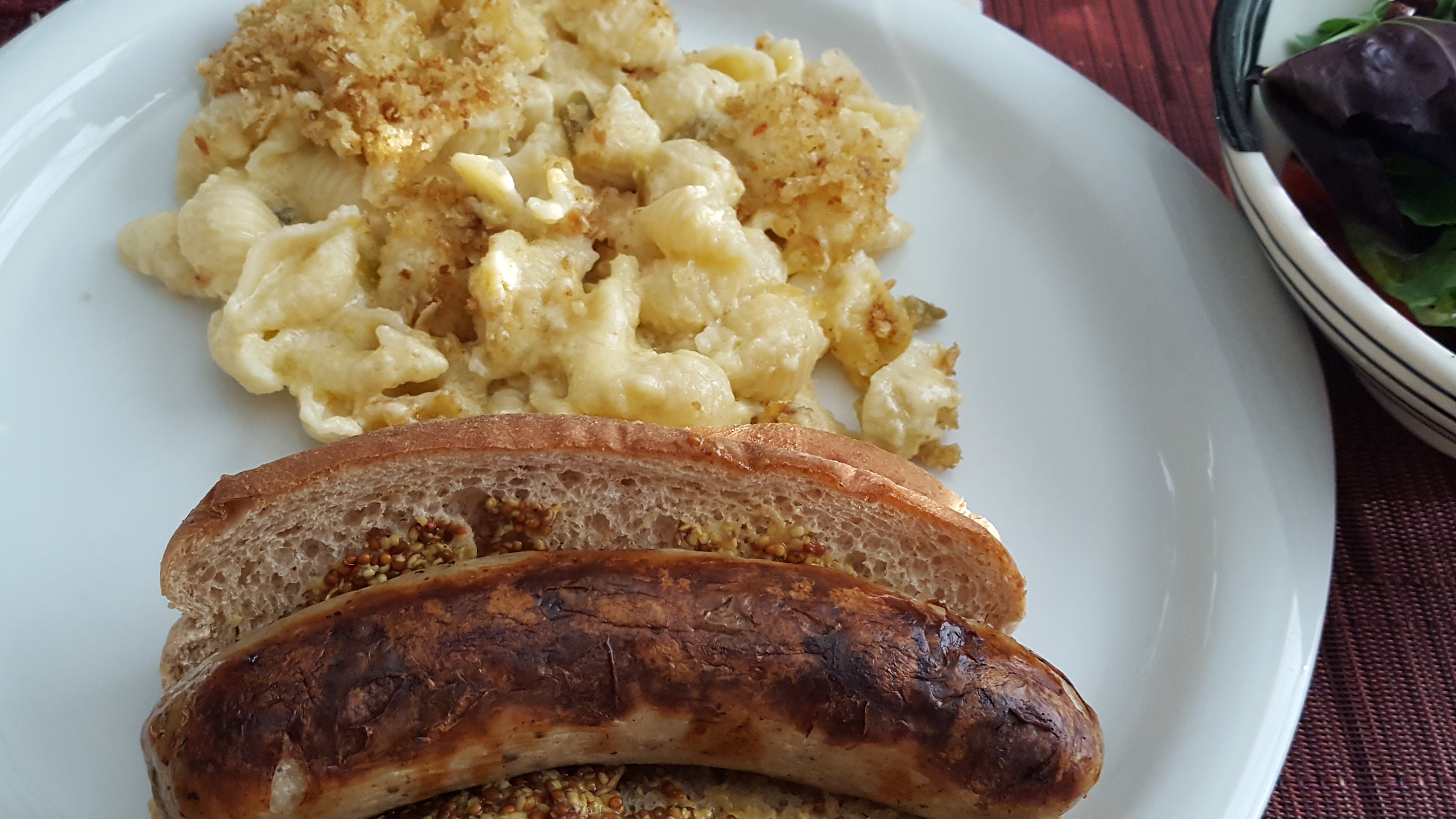 20160904_183428 Published at 3264 × 1836 in September’s Best Bites « Previous Next » Bratwurst (the pale kind, not red) & mac ‘n’ cheese