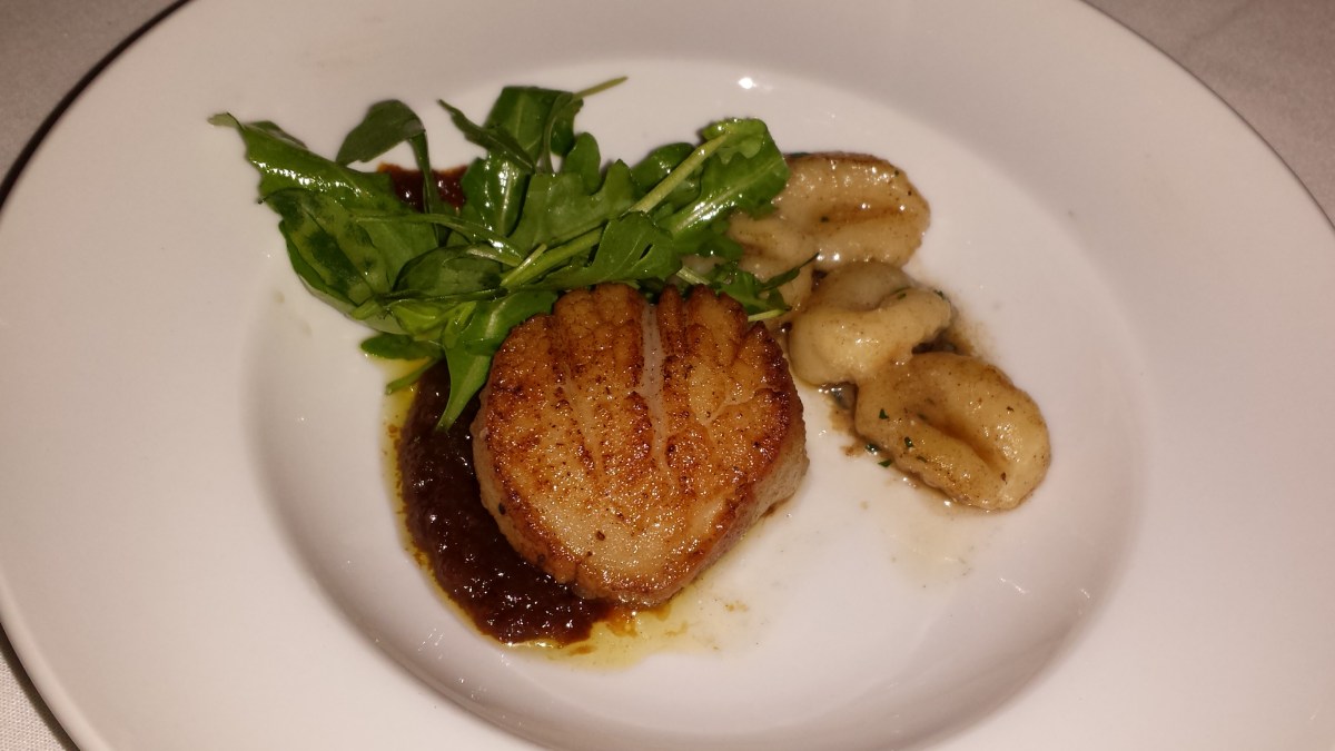 Seared Sea Scallop, Cheddar gnocchi, roast garlic jam Published at 3264 × 1836 Scallop w/Cheddar Gnocchi